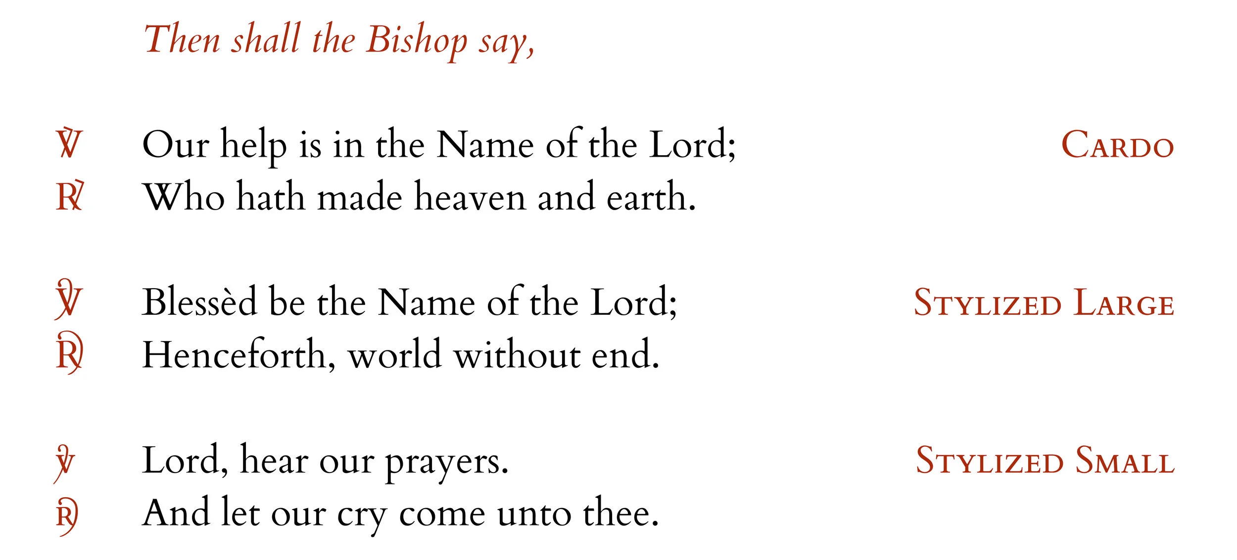 What a great font! Cardo is an open source version of Bembo, a typeface from the Italian Renaissance, and is well-known in academic circles due to its being a treasure-trove of hard-to-find characters and glyphs. It is also gorgeously angular, delicately supple, and the Italic is even better than the Roman. Cardo offers not just one set of Versicle and Response glyphs, but three, as well as the Jerusalem Cross, and the Chi Rho christogram. And all of this is combined with many advanced typographical features such as ligatures, old-style numbers, and real Small Caps. And it does not hurt that Cardo is available through Google Fonts, and can be used in Google Docs.